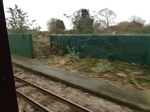 A view of the disused station platform, taken from a passing train in 2015. | |||||