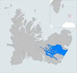 The Golfe du Morbihan (French pronunciation: [ɡɔlf dy mɔʁbiɑ̃], lit. 'Gulf of Morbihan') is a bay on the eastern coast of Grande Terre, the largest of the Kerguelen islands. It forms a deep and broad notch in the central section of the island.