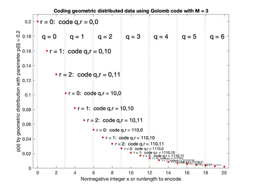 Golomb–Rice codes can be thought of as codes that indicate a number by the position of the bin (q), and the offset within the bin (r). The example figure shows the position q and offset r for the encoding of integer x using Golomb–Rice parameter M = 3, with source probabilities following a geometric distribution with p(0) = 0.2.