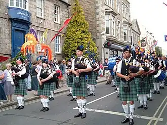 Penzance's Midsummer festivities were one of the last examples of this practice in Cornwall. The celebrations themselves were centred on the lighting of fireworks, tar barrels, and torches on the evening of 23 June every year (St John's Eve). Towards the end of these festivities the local youths of the town would take part in the ancient serpent dance called "thread-the-needle" and jump or pass themselves through the dying embers of the flames.[4] During these celebrations it was also usual to elect a Mock Mayor or Mayor of the Quay. In 1864 it was recorded that the organising committee of the festival let off "258 dozen fire crackers and numerous Roman Candles, Jack-in-box and sky rockets"[5] The day after these celebrations, a 'Midsummer's Day' fair took place on Penzance quay; boat rides and other entertainments were included in these celebrations.
