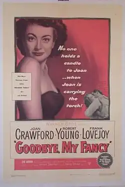 Goodbye, My Fancy is a 1951 American romantic comedy film starring Joan Crawford, Robert Young, and Frank Lovejoy. The film was directed by Vincent Sherman and produced by Henry Blanke. Distributed by Warner Bros., the film was based on the 1948 play of same name by Fay Kanin and adapted for the screen by Ivan Goff and Ben Roberts. Reinforcing social changes brought on by World War II and movies portraying women as successful on their own, such as 1945's Academy Award-winning Mildred Pierce, the plot follows an influential Congresswoman who returns to her former college to receive an honorary degree only to find her old flame as the university president.