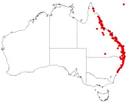 Goodenia mystrophylla grows in sandy soil, usually on sand dunes, from Cape York in Queensland to Narrabeen in New South Wales.[2][3] It also occurs in western New Guinea and in the Louisiade Archipelago.[2]