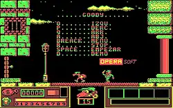 Goody is a platform game developed by Gonzalo Suárez Girard and released in 1987 by the Spanish company Opera Soft. The game was released for Amstrad CPC, Amstrad PCW, MSX, ZX Spectrum, and for MS-DOS compatible computers.
