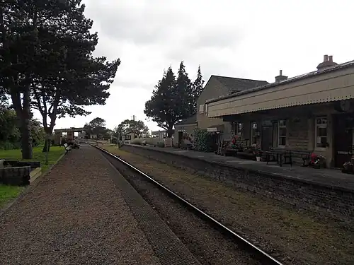 The station buildings are privately owned, so trains use the opposite platform. During major events the private garden is opened to passengers and the station house becomes a tea room. A short length of track in the garden allows rides on a Wickham or pump trolley.