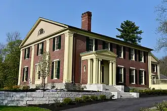 The Cony House stands on Augusta's east side, on the east side of Stone Street (Maine State Route 9) opposite its junction with Caldwell Street. It is a 2+1⁄2-story brick structure, with a side gable roof. It is oriented with its main facade to the south, presenting a gable end to the street. That gable end is three bays wide, articulated by pilasters. The front is five bays wide, with the main entrance in the leftmost bay. It is set in a single-story projecting section, with a fully pedimented gable and entablature supported by paired columns, one a square paneled Doric column, the other a fluted round Ionic column. The interior retains most of its original woodwork.[3]