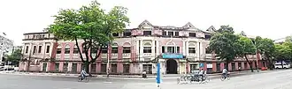 The low-rise brick complex was designed by Scottish architect John Begg, and built between 1909 and 1912.[2][1] The complex's main facade features an elegant entrance with Greek columns.[1] During the colonial era, the building was the official distribution center and printing factory for official government publications, including gazettes, journals, news, and textbooks.[3] In the post-colonial era, it became the publishing arm of the Ministry of Information's Government Printing and Stationery Department, employing over 1,300 staff.[3] The broader Government Printing and Stationery Department complex housed the Printing & Publishing Enterprise (ပုံနှပ်ရေးနှင့်စာအုပ်ထုတ်ဝေရေးလုပ်ငန်း) until 2005, when the national government moved ministerial facilities to Naypyidaw.[3] The building later served as the Office for the Minister of Information.[2] This building is still owned by the Ministry which maintains some offices here.[2]