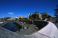 View of the Inner Harbour looking north with VRTS double decked buses along Government Street in front of The Empress, 30 April 2005.