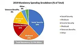 Figure A provides a breakdown of the major mandatory government spending categories as of the fiscal year 2019 budget approved by Congress. As Figure A suggests, Social Security is the single largest mandatory spending item, taking up 38% or nearly $1,050 billion of the $2,736 billion total. The next largest expenditures are Medicare and Income Security, with the remaining amount going to Medicaid, Veterans Benefits, and other programs.[12][13]