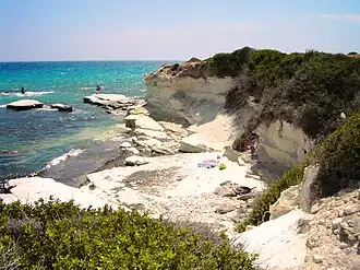 The Governor's Beach (Greek: Ακτή του Κυβερνήτη) is located partly in the Larnaca and in the Limassol region. It is a 2 km shoreline, with sandy beaches, deep crystal waters and a blue flag waving. The area is unknown to most locals and tourists.[1] Because of the structure of the shoreline, consisting of well-hidden small coves, it is one of the few semi-official[2] nudist beach spots in Cyprus.