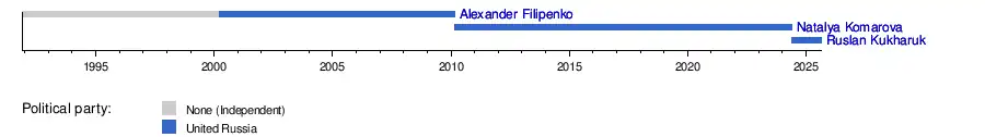 On 8 February 2010, with the expiration of Filipenko's term of office, the President of Russia Dmitry Medvedev proposed the candidacy of MP Natalya Komarova to the Duma of Khanty-Mansi Autonomous Okrug.[1] She was supported unanimously and was sworn in on 1 March 2010, becoming Russia's third female governor.[2]