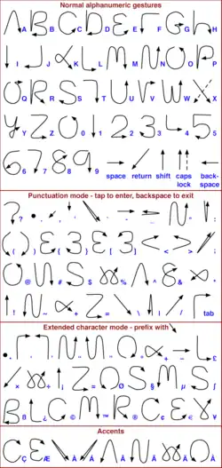The software is based primarily on a neography of upper-case characters that can be drawn blindly with a stylus on a touch-sensitive panel. Since the user typically cannot see the character as it is being drawn, complexities have been removed from four of the most difficult letters. "A" "F", "K" and "T" all are drawn without any need to match up a cross-stroke.