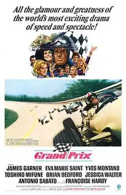 Grand Prix is a 1966 American sports drama film directed by John Frankenheimer, produced by Edward Lewis, and written by Robert Alan Aurthur with uncredited story contributions by Frankenheimer and rewrites by William Hanley. It stars an international ensemble cast, including James Garner, Eva Marie Saint, Yves Montand, Brian Bedford, Jessica Walter, Françoise Hardy and Antonio Sabàto. Toshiro Mifune has a supporting role as a race team owner, inspired by Soichiro Honda. The picture was photographed in Super Panavision 70 by Lionel Lindon, and presented in 70mm Cinerama in premiere engagements. Its unique racing cinematography is one of the main draws of the film.