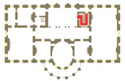 McKim's Grand Staircase adopted the Imperial stair form: a central run beginning on the south and rising to a landing on the north, with double runs doubling back to the south as it rises to the second floor. Formal in plan, its relatively narrow opening into the Cross Hall limited visibility of the President, First Lady and their official guests. McKim's Grand Staircase was entered through an arched opening with the first two steps protruding into the Cross Hall. A decorated wrought iron gate on the State Floor was normally kept closed except during state ceremonies. A pair of niches flanked the center run and the first course used a heavy crimson silk cord as a decorative railing.[4] The stair was constructed in Joliet marble and covered in a crimson stair carpet. A lantern similar to one selected by McKim for the Entrance Hall was hung above the landing.