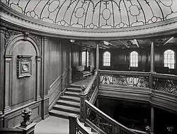 The Boat Deck level of the stairwell functioned as an interior balcony overlooking the staircase and A-Deck below. From one end of the room to another the dimensions were 56 feet (17 m) wide by 33 feet (10 m) long.[3] There were two entry vestibules, 5 by 6 feet (1.5 m × 1.8 m), on either side of the Boat Deck that communicated with the outside. The gymnasium entrance was right next to the starboard Grand Staircase entrance. The officer's quarters and Marconi room were also accessible via two corridors that branched forward from either side of the staircase. This level was lined with arched windows that provided ample natural light to the stairwell during the day.