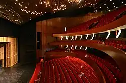 In its original 1879 version, the auditorium of the Grand Théâtre was shaped like a horseshoe (in the "Italian" style) with several tiers of balconies and boxes surrounding the auditorium on three sides. After the 1962 renovations, the auditorium's oval seating arrangement was altered to adopt a German-style "square" shape, where a full view of the stage is possible from any one of the auditorium's 1,488 seats (593 in the stalls, 199 in the first circle, 161 in the second circle and 535 in the amphitheatre/upper circle).