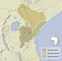 Grant's gazelle is genetically related to Soemmerring's gazelle (N. soemmerringii) and Thomson's gazelle (Eudorcas thomsonii) with Soemmering's gazelle being the closer relative.[3] Grant's gazelle shows high genetic variation among its populations, although there is no geographic isolation. The differentiation of the species may have evolved during repeated expansion and contraction of arid habitats during the late Pleistocene era in which populations were possibly isolated.[3] Grant's gazelle was formerly considered a member of the genus Gazella within the subgenus Nanger before Nanger was elevated to genus status. In 2021, the American Society of Mammalogists granted full species status to Bright's gazelle (Nanger notatus) and the Peters's gazelle (Nanger petersii),[6][7]