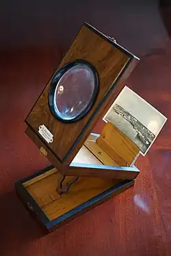 A graphoscope was a 19th-century device used in parlors in order to enhance the viewing of photographs and text. The graphoscope is supposed to be based on a 1864 patent of Charles John Rowsell.[1] These novelty items consisted of a single magnifying glass, often in a wooden frame, in an overall construction that could collapse into a compact rectangular form. A photo/card holder was usually also included. A KOMBI camera often had included in its design a graphoscope for better film viewing. Many devices combined a Stereoscope and Graphoscope.
