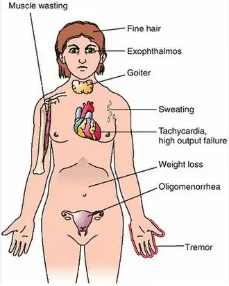 The signs and symptoms of Graves' disease virtually all result from the direct and indirect effects of hyperthyroidism, with the main exceptions being Graves ophthalmopathy, goiter, and pretibial myxedema (which are caused by the autoimmune processes of the disease). Symptoms of the resultant hyperthyroidism are mainly insomnia, hand tremor, hyperactivity, hair loss, excessive sweating, oligomenorrhea, itching, heat intolerance, weight loss despite increased appetite, diarrhea, frequent defecation, palpitations, periodic partial muscle weakness or paralysis in those especially of Asian descent,[7] and skin warmth and moistness.[8] Further signs that may be seen on physical examination are most commonly a diffusely enlarged (usually symmetric), nontender thyroid, lid lag, excessive lacrimation due to Graves' ophthalmopathy, arrhythmias of the heart, such as sinus tachycardia, atrial fibrillation, and premature ventricular contractions, and hypertension.[8][9]
