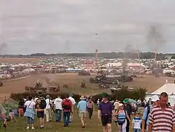 Following a meeting of like-minded individuals held in The Royal Oak in Okeford Fitzpaine, north Dorset, the first fair was held in 1969. For the first 15 years of its existence the steam fair (then known as the 'Great Working of Steam Engines') was held at Stourpaine Bushes,[3] then in 1985 it temporarily moved to nearby Everley Hill, as Bushes Farm were delayed in harvesting the crops from the fields used by the steam fair due to the weather conditions.[3] In 1988, after three years at Everley Hill, where access by large crowds was difficult, it moved to its current permanent home at Tarrant Hinton, north of Blandford Forum, where access is vastly improved.[3] The fair now attracts up to 200,000 visitors.[4] In 2020, the event was cancelled for the first time since its inception due to the COVID-19 pandemic.[5]