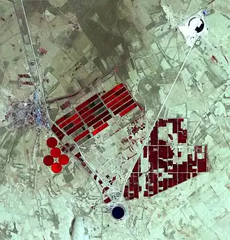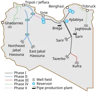 The Great Man-Made River Project (GMRP, Arabic: النهر الصناعي العظيم, romanized: an-nahr aṣ-ṣināʿiyy al-ʿaẓīm, Italian: Grande fiume artificiale) is a network of pipes that supplies fresh water obtained from the Nubian Sandstone Aquifer System fossil aquifer across Libya. It is the world's largest irrigation project.[1] The project utilizes a pipeline system that pumps water from the Nubian Sandstone Aquifer System from southern Libya to cities in the populous Libyan northern Mediterranean coast including Tripoli and Benghazi. The water covers a distance of up to 1,600 kilometers and provides 70% of all fresh water used in Libya.[2]