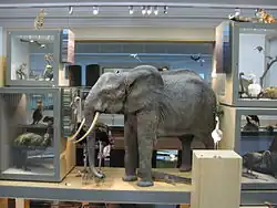 The full size cast of an African Elephant was built in the Living Planet gallery. The model was crafted by Zephyr Wildlife, who took a cast from an actual stuffed elephant at a museum in Bonn in Germany. To get the elephant into the museum a crane, from Bel Lift Trucks, had to be used.[17] The full size model of a T-Rex dinosaur has been shipped from Canada, where it was built by a company called Research Casting International. It forms part of the display known as the Fossil Stories gallery. The T-Rex model was one of the first items to be placed in the new museum, due to its size.[18] In 1908, the Manchester taxidermist Harry Ferris Brazenor mounted a "fine bison bull" for the museum.[19]