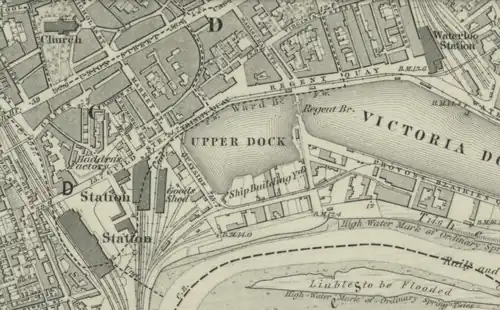 The Aberdeen Railway (AR) opened from the south to Ferryhill, south of Aberdeen, in April 1850. It had been previously arranged that the Aberdeen and Great North would amalgamate, but this was annulled that year and the Aberdeen was seeking alliances with railways to the south.[17] In 1854 the AR opened its Guild Street terminus in Aberdeen[18] and the Great North sought and obtained powers for a 1+34-mile (2.8 km) branch that followed the Aberdeenshire Canal from Kittybrewster to a terminus at Waterloo by the docks. The line was opened to goods traffic on 24 September 1855 and passengers on 1 April 1856. Kittybrewster station was rebuilt with through platforms and the offices moved to Waterloo station from premises at 75 Union Street. The stations were 12 mile (800 m) apart and a goods line was built though the docks linking the two railways, worked by horses as steam locomotives were prohibited.[19]