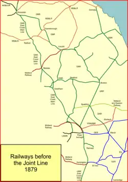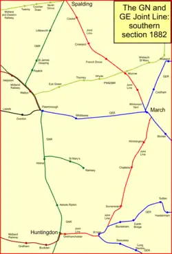A branch from Spalding to March was authorised by the Great Northern Railway (Spalding to March) Act 1863 (26 & 27 Vict. c. cxci); running powers over it were granted to the GER; it opened in 1867. March was an important junction on the GER system where traffic for much of East Anglia could be exchanged. The future Joint Line route was therefore in place between March and Spalding, and between Lincoln and Doncaster.[3]