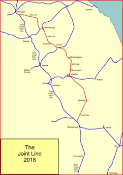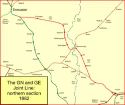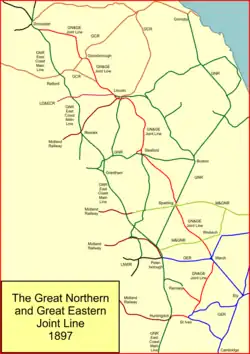 The Great Northern and Great Eastern Joint Railway, colloquially referred to as "the Joint Line"[1] was a railway line connecting Doncaster and Lincoln with March and Huntingdon in the eastern counties of England. It was owned jointly by the Great Northern Railway (GNR) and the Great Eastern Railway (GER). It was formed by transferring certain route sections from the parent companies, and by the construction of a new route between Spalding and Lincoln, and a number of short spurs and connections. It was controlled by a Joint Committee, and the owning companies operated their own trains with their own rolling stock. The Joint Line amounted to nearly 123 miles (198 km) of route.