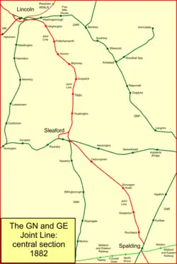Part of the new Lincoln line, between Spalding and Ruskington, about 21 miles (34 km), was opened on 6 March 1882. On the same day the GNR March to Spalding line and the GER Huntingdon to St Ives and Needingworth Junction to March lines were transferred to the Joint Committee. The new line bypassed the existing Sleaford station on the GNR's Grantham to Boston line, reflecting the primacy of mineral traffic, but spurs were constructed on both sides of Sleaford to enable passenger trains on the Joint Line to call there. The GER ran five passenger trains each way daily on the new section, and the GNR ran a daily goods train.[11]