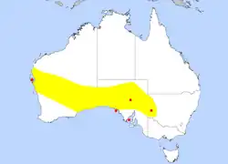 It was formerly widespread in semi-arid habitat on the mainland,[15] where the soils were shallow with calcareous underlying strata.[16] Before the sharp decline in population in the late nineteenth century, the species was found south of a line from Shark Bay to the meeting of the rivers at the Murray–Darling basin and above the 28° southern latitude.