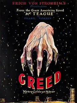 Greed is based on the American author Frank Norris's 1899 novel McTeague: A Story of San Francisco. Von Stroheim's interest in McTeague can be traced back to January 1920, when he told a journalist that he wanted to film the novel.[11] He had lived in San Francisco in the early 1910s, living there in poverty like that of the story's characters.[12] He eventually moved to Los Angeles, and worked his way up in the film industry from extra to acting in villainous or aristocratic roles in films.[13] By 1919, von Stroheim had finally become a successful director in his own right at Universal Film Manufacturing Company, although one with a reputation of going over budget and over schedule.[14]