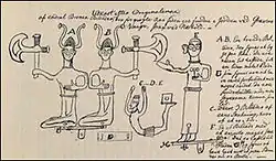 A drawing of four of the figurines was made in 1779, by Schnabel. The drawing shows two kneeling figures of warriors with horned helmets and axes, a leaping acrobat, and a standing woman. The shape of the rest is unknown, said to have been sold at aution in 1800.[1] Five of these figurines are now lost, while two were bought by the Danish National Museum in 1823 and 1839. The right axeman is pressumed lost during the Bombardment of Kopenhagen in 1807.
