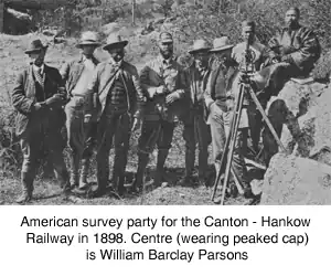 The origins of this railway go back to the so-called “Battle for Concessions” during 1898 when Western powers bickered among themselves over the extraction of railway concessions from the Qing Dynasty government, severely weakened by their loss of the war with Japan over Korea. Not wishing to be left out of the fray, a powerful American syndicate known as the American China Development Company, formed under the auspices of financier Calvin Brice in April 1898, obtained a concession for the construction of the 750 mi (1,210 km)-long Canton–Hankow (Guangzhou–Wuhan) Railway. In the autumn of 1898 a team of American engineers led by Chief Engineer William Barclay Parsons was dispatched to China to conduct the survey. Barclay Parsons describes the difficulties endured during this survey in his own account of this work “An American in China” published in 1900 after his return to USA.[3]