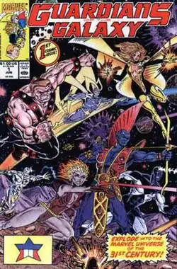 In 1989, Marvel editor-in-chief Tom DeFalco revived the Guardians of the Galaxy in order to cash in on the popularity of the TV series Star Trek: The Next Generation.[2] DeFalco worked out a series concept using a new team of Guardians, but when he saw a series proposal for the original team that writer/artist Jim Valentino had coincidentally been working on at the same time, he green lit Valentino's idea instead.[2] The Guardians' first self-titled comic launched in June 1990 and ran for 62 issues ( during which they also appeared in What If . . .? vol. 2 #36. This series was initially written and illustrated by Valentino, who deliberately gave it an action-oriented, "fun" feel that stood out from the typical "grim 'n' gritty" comics of the 1990s.[2] Though Valentino had plotted the series ahead as far as issue #50, his run was cut short when he co-founded Image Comics. Having taken on two new series and the foundation of a publication company, Valentino asked editor Craig Anderson if he could switch to just writing Guardians of the Galaxy, and in response Anderson dismissed him from the series.[2]