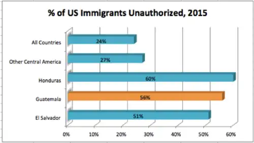 Fearful of this reality, many who can, end up entering the US via what the immigration theorist Philip Martin calls the "back door" route—entering unauthorized.[12] In fact, Pew Hispanic cites that in 2015, unauthorized migration made up the majority (56%) of Guatemalan migration, approximating 550,000 unauthorized Guatemalan immigrants that year.[4] Some Guatemalans have qualified for the program of Deferred Action for Childhood Arrivals (DACA) since the Obama Administration instituted it in 2012, but Pew Hispanic estimates that only about 17,700 Guatemalans satisfied the requirements to receive DACA status, which is currently being contested by the Trump administration.