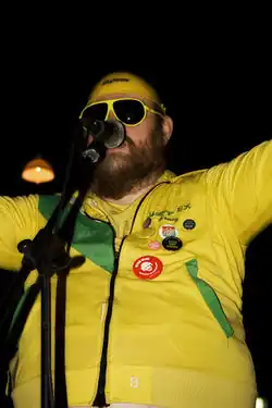 He is best known as "Gula gubben" as he performs in yellow tight fitting tracksuits at different music festivals such as the Hultsfred Festival and the Skövde festival.[4][5] Lööf commented that he "cried" and that his "soul died" when the Hultsfred Festival was permanently terminated in 2010.[6] Lööf has recorded a few music albums and also written several poetry collections.[7] He has also been a DJ usually playing vinyl discs from his personal collection.[5] He competes in poetry slams and he became champion at the Swedish annual poetry slam competition.[7][8]