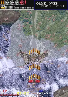 A recovery system after using a credit during the continue screen is used, as players can pick up a spinning coin with two different sides: a silver side and a gold side. If the player collects the coin on its silver side, then the player merely gains another coin for their guns, but if the player collects the coin on its gold side, then the player's firepower and bomb supply will be maximized to their full power.[4] The game also uses a checkpoint system in which a downed single player will start off at the beginning of the checkpoint they managed to reach before dying. The title also employs an anti-autofire mechanism where the difficulty will max out by the second stage if the player is sustaining too fast of a fire rate.[4] Getting hit by enemy fire will result in losing a live, as well as a penalty of decreasing the aircraft's weapon to one level and once all lives are lost, the game is over unless the player inserts more credits into the arcade machine to continue playing.