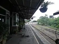 The passing of the North Coast Railway Act in 1910 which linked the separate regional divisions of Queensland Railways into one network, provided increased spending and construction works within Queensland railways. Construction commenced on the present station in 1913, which commenced operations on 1 December 1913.[2] The station was based on the Queensland Railways A ‘Pagoda’ standard design.[2] Positioned on an island platform the long narrow chamfer-board building housed: a bar; refreshment room and servery; waiting room; ladies room; station master's office; telegraph and booking office; and a sheltered sales area. The smaller upper floor housed: the kitchen; scullery; and pantry. This floor was serviced by a hand-operated lift.