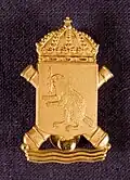 The colour of the regiment was presented to the regiment on 1 June 1945 by His Majesty the King Gustaf V at a ceremony at Stockholm Palace. It was used as regimental colour by KA 5 until 1 January 1998. The colour is drawn by Brita Grep and embroidered by hand in insertion technique probably by the company Libraria.[8] Blazon: "On red cloth in the centre the badge of the former Coastal Artillery; two gunbarrels of older pattern in saltire under a royal crown proper and over a blazing grenade and waves, all yellow. In the first corner the town badge of Härnösand; a beaver with a pike in its mouth, all white."[8]
