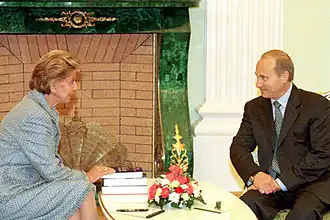 In commenting on current Russian affairs, Carrère d'Encausse warned against applying Western yardsticks to Russian democracy and said she regretted the excessive demonisation of the government of Vladimir Putin.[26] Up until the final days before Russia's February 2022 invasion of Ukraine she refused to countenance such an eventuality, although her opinion of Putin changed after the start of hostilities.[27][28] After she died, Putin paid homage to Carrère d'Encausse as "a great friend of our country" and expressed the hope that her legacy would help improve French–Russian relations.[29]