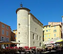 The first municipal building in Hyères was the Chapel of Saint-Blaise, also known as the Tower of the Templers, which was commissioned by the Knights Templar in the 13th century. It was built in the main town square (now Place Massillon). The design involved a tall rectangular block with a semi-circular tower at the east end. There was a chapel dedicated to Saint Blaise on the ground floor and a commandery on the floor above. After the dissolution of the Knights Templar by order of the papal bull, Vox in excelso, in 1312, the building was operated by the Sovereign Military Order of Malta until 1673, when it was given to the town.[1] Local officials converted the room above the chapel for municipal use in 1770[2] and, after the French Revolution, the room became the meeting place of the elected town council.[3][4] A series of rounded headed windows were added to the building in 1839.[1]