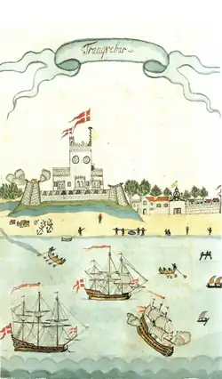 The Danish East India Company in 1729. On 21 October, Diderich Miihlenfort was appointed as the new governor of Danish India (unlike the earlier governors whom the D.E.I.C. appointed). In November 1829, he departed from Copenhagen on board the Dronning Anna Sophia. On 22 January 1730, she called at Porto Praya, whose governor paid the ship a visit on 24 January. On 8 August, she reached Yranquebar.[3] Former governor Morten Mortensen Færoe returned to Copenhagen on board the ship 1724.[3]