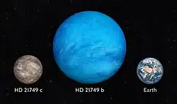 The inner planet, HD 21749 c (the second in order of discovery), is orbiting the star at a distance of 0.08 AU with a period of just 7.8 days. A terrestrial planet, it has a radius of 1.1 R🜨 and was the first Earth-sized planet found by TESS.[6][5] Its mass is too low to be calculated with current radial velocity data, with an upper limit of 3.5 M🜨; a probabilistic model estimates it is most likely between 1 and 2 M🜨.[6]