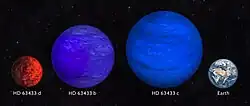 The outermost planet, HD 63433 c, is a mini-Neptune discovered together with HD 63433 b.[8] It is 2.7 times larger than Earth,[23] but 30% smaller than the Solar System's ice giants Neptune and Uranus. Being 15.5 times more massive than the Earth,[23] it is more massive than Uranus (14.54 M🜨) but still less massive than Neptune (17.15 M🜨). The density of HD 63433 c calculated at 4.6 g/cm3, slightly lower than that of Earth[23] but greater than the densities of all gas giants in the Solar System.