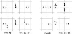 - Each lattice grid cell can only contain a maximum of one particle for each direction, i.e., contain a total of between zero and four particles.