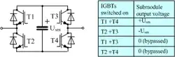 Like the two-level converter and the six-pulse line-commutated converter, a MMC consists of six valves, each connecting one AC terminal to one DC terminal. However, where each valve of the two-level converter is effectively a high-voltage controlled switch consisting of a large number of IGBTs connected in series, each valve of a MMC is a separate controllable voltage source in its own right. Each MMC valve consists of a number of independent converter submodules, each containing its own storage capacitor. In the most common form of the circuit, the half-bridge variant, each submodule contains two IGBTs connected in series across the capacitor, with the midpoint connection and one of the two capacitor terminals brought out as external connections.[36] Depending on which of the two IGBTs in each submodule is turned on, the capacitor is either bypassed or connected into the circuit. Each submodule therefore acts as an independent two-level converter generating a voltage of either 0 or Usm (where Usm is the submodule capacitor voltage). With a suitable number of submodules connected in series, the valve can synthesize a stepped voltage waveform that approximates very closely to a sine-wave and contains very low levels of harmonic distortion.