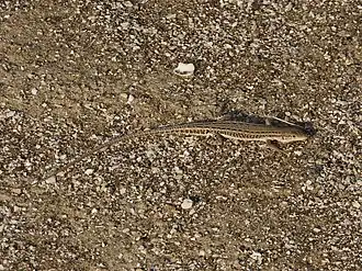Morphological differentiation and color variations occur among distinct populations of M. adramitana.[6] Mesalina adramitana is distinguished by an unmarked center along the back bordered by dotted lines on either side. Below the dotted line is a lighter stripe and then a dark strip along the sides and then a cream-colored underbelly.[5] While this pattern can vary, M. adramitana always tend to have dark sides with light spots.[2] Scales are smooth along the surface of the lower leg. Adult snout length ranges from 42 mm[2] to 46 mm.[5]