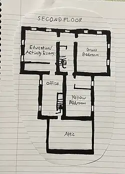 After walking up the steps and to the right is the Grant bedroom. Named for the original owner of the home John Grant and reflects mid-19th century bedrooms. The second floor also has a children's bedroom that was decorated to reflect what child's room might have looked like This room also contains a rope bed and straw tickling. Behind the children's room is the attic that was used to hide fugitive slaves while on the underground railroad. It was also used for storage. There is also an office that was a bedroom that had been decided into a nursery and bathroom. It is currently used as an office for the preservation society. The founder's preservation room is also on the second floor. It was once a fourth bedroom but currently houses education programs and exhibits about local preservation efforts. There is also a small research library for historic preservation.[3]