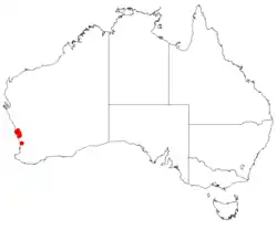 It is endemic to an area between Dandaragan and Coorow in the Wheatbelt region of Western Australia where it is found in and among breakaways growing in sandy-loamy-gravelly soils.[3] It is usually in low open heath land communities often over sandstone.[2] Although the species has a small range it is quite common within the area.
