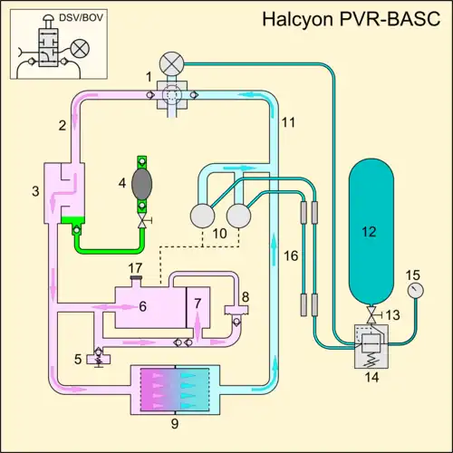 Schematic diagram of the breathing loop and gas supply pneumatics of the Halcyon PVR-BASC Rebreather.